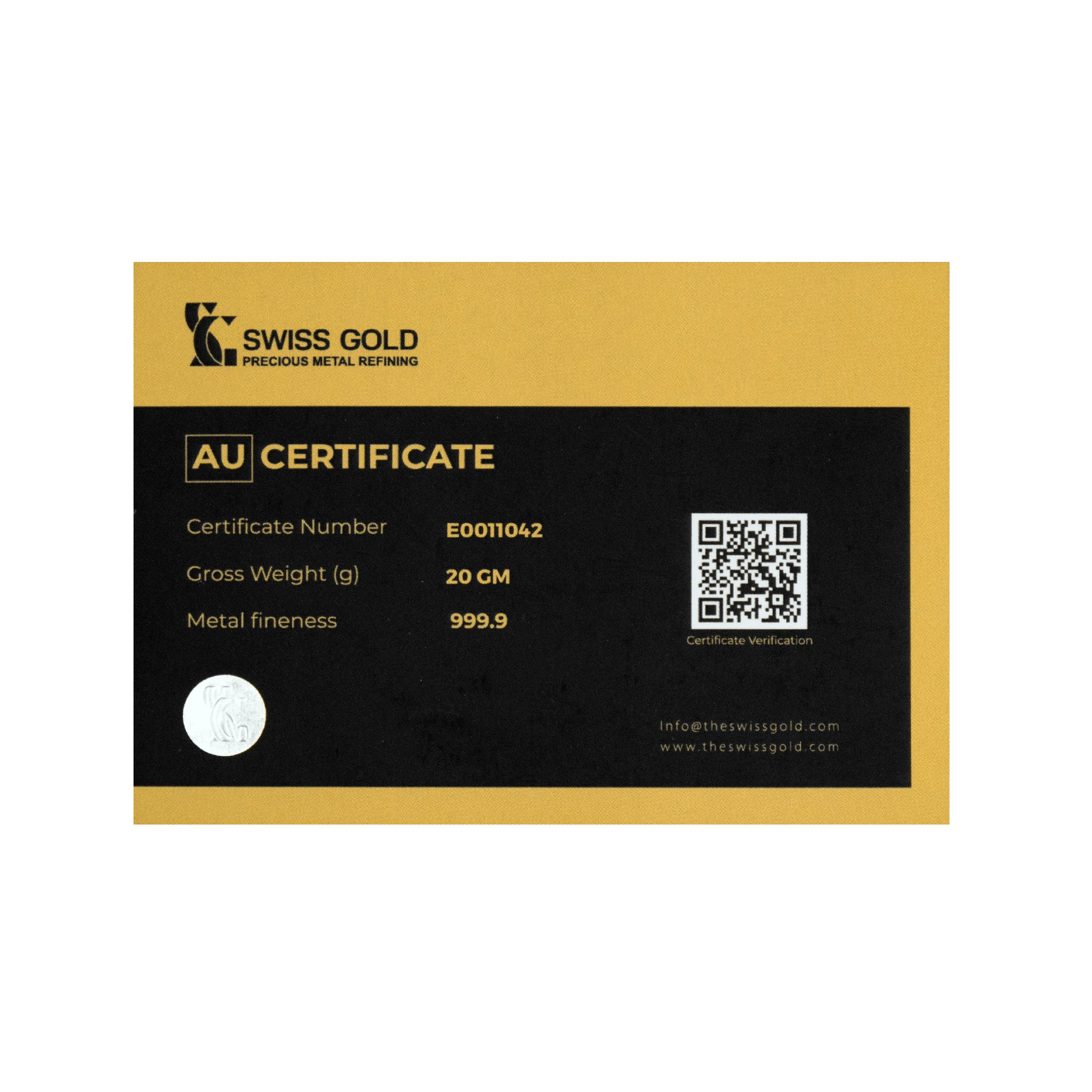 Minted in 999.9 fine gold, this 20g ingot reflects Swiss quality and careful attention to detail. Certified and neatly packaged, it supports steady and thoughtful saving or investment strategies.