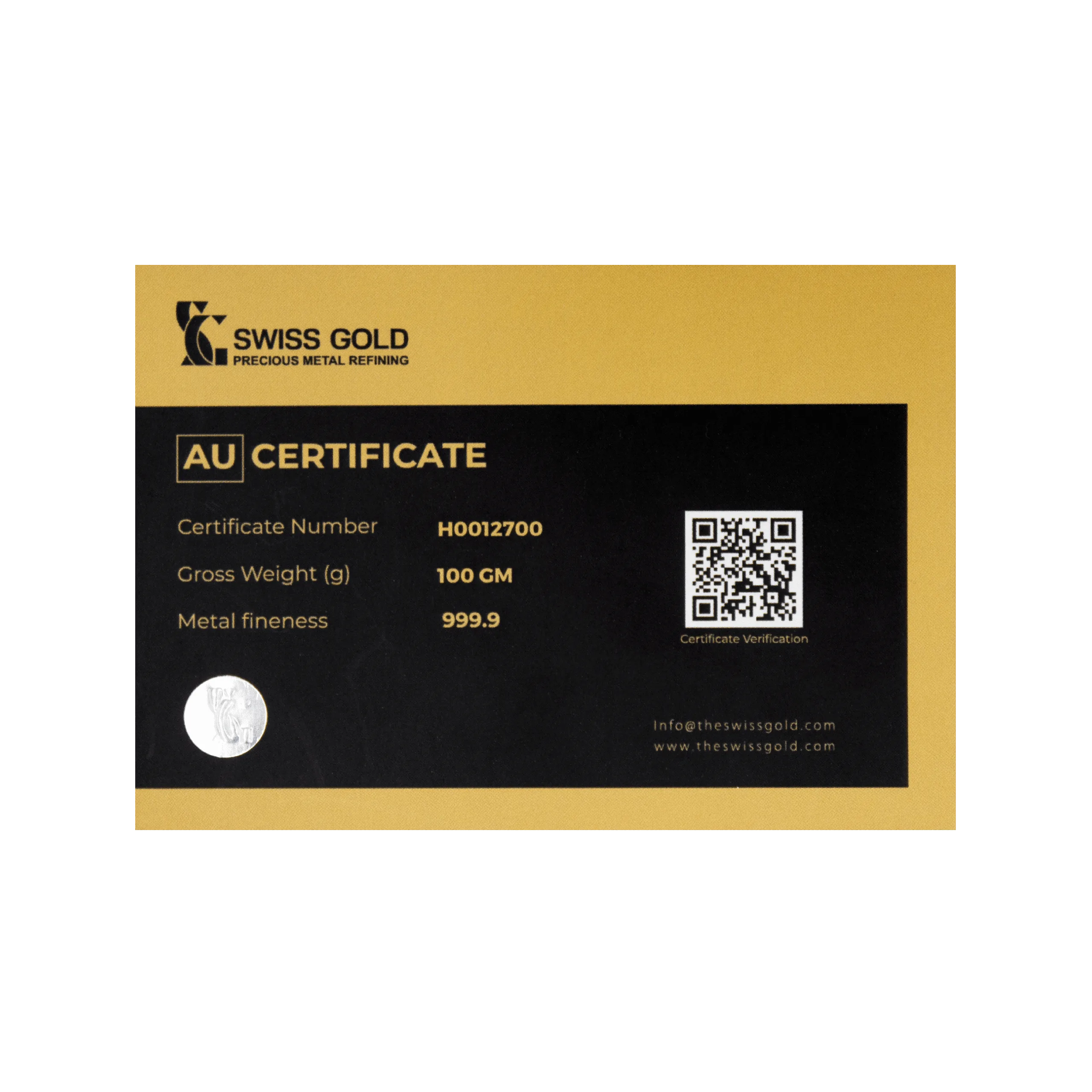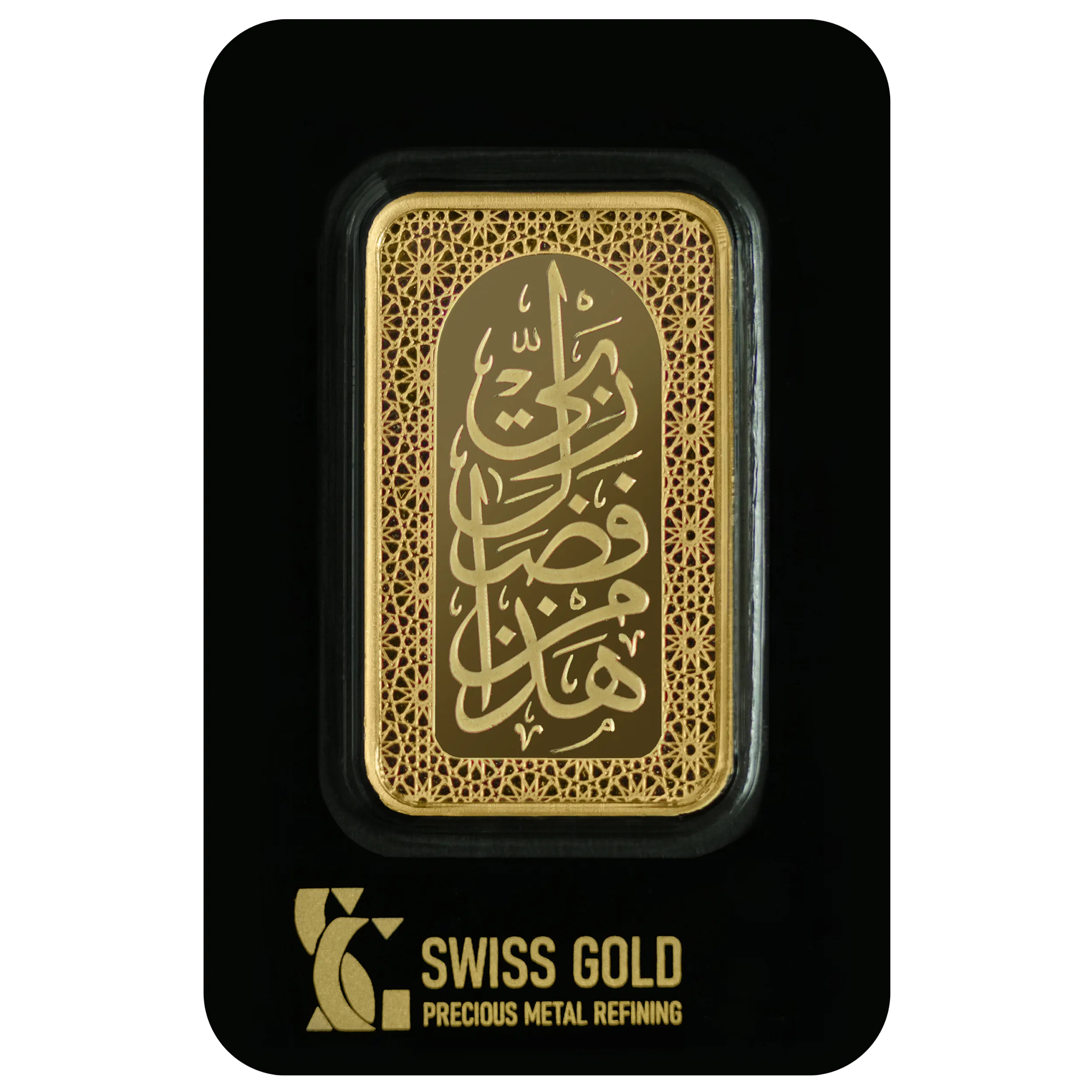 This 100g gold ingot is made from 999.9 fine gold and beautifully inscribed with the Quranic verse “This is by the grace of my Lord.” Crafted to Swiss standards, each piece is securely enclosed in sleek packaging with a visible seal indicator and certified for its purity and quality. It is a meaningful choice for long-term savings, personal investment, or gifting.